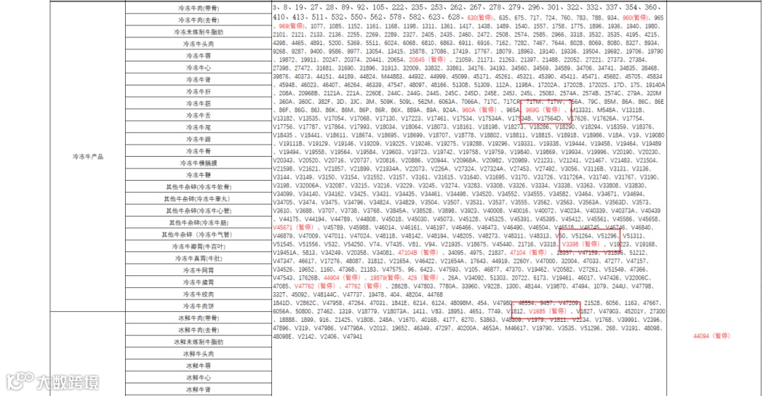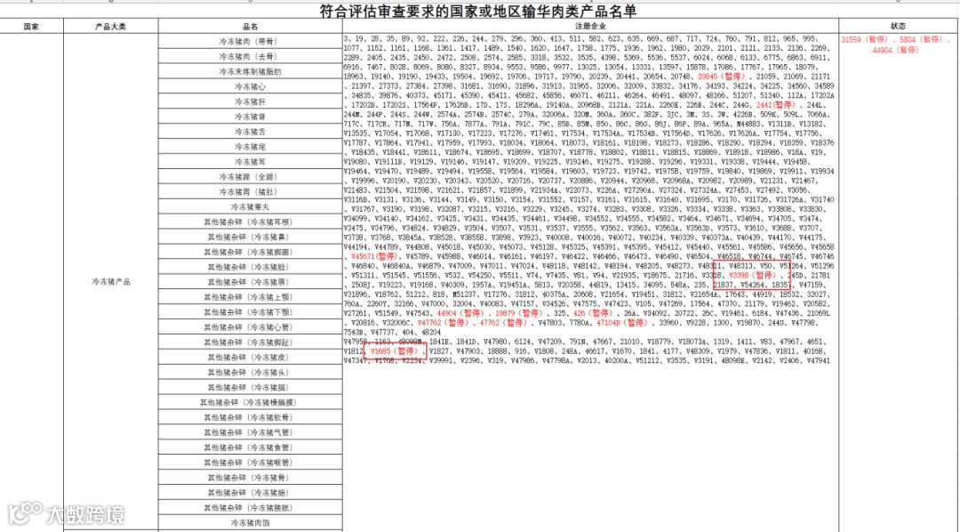 2024年7月31日,海关总署更新《符合评估审查要求的国家或地区输华肉类产品名单》,暂停受理美国注册编号为969G、V1685、V3398的企业自2024年7月30日起启运的输华肉类产品进口申报。
