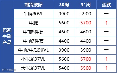 第31周进口牛肉期货市场上,本周巴西工厂报盘参与度、报盘量整体不及上周:阿根廷和乌拉圭工厂报盘积极性基本维持此前局面,盘量无明显变化。价格方面,南美三国大部分工厂报价均企稳,少数工厂将报价上调100美元/吨左右,同时也有个别工厂将偏高报价下调。