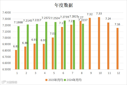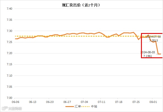 2024年第31周,周中最低7.1961,最高7.2813,周内人民币快速升值。周均价 7.2431,与第29周均价 7.2798,相较下降0.50%。2024年8月截至目前平均现汇卖出均价7.2237,环比下降0.81%,同比上升6.60%。