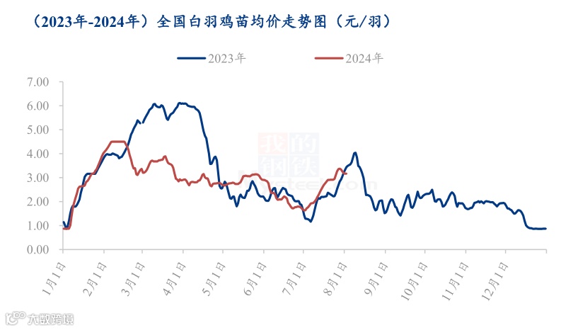 31周白羽鸡苗均价为 3.28 元/羽,较上周均价上调 0.34 元/羽,环比涨幅 11.56%,同比涨幅 11.56%。本周白羽鸡苗价格涨至高位后回落。上半周,白羽鸡苗价格上涨,周后期,随着气温升高以及雨水天气的影响,养殖端出栏积极,毛鸡出现压价收鸡,对鸡苗价格有一定打压。