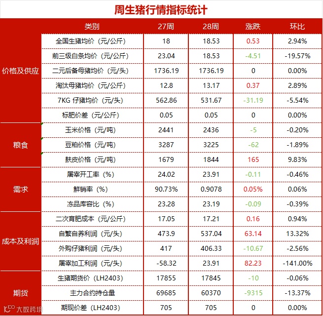 第28周全国生猪出栏均价在 18.53 元/公斤,较上周上涨 0.53 元/公斤,环比上涨2.94%,同比上涨 33.02%。本周猪价震荡上行,情绪坚挺有所支撑,价格重心偏强上移。供应方面来看,企业出栏节奏平缓,市场多有控量抬价操作,养户出货灵活分批为主,短期供应表现较平稳。需求方面来看,天气炎热,终端白条批发依旧烂市表现,屠企宰量及鲜销情况仍较一般,不过二育动态稍显积极,对猪价略有支撑。整体来看,供需阶段性博弈僵持,二育动态提升支撑情绪,但涨价后或有降温,中旬规模场出栏增量预期仍存,消费暂无明显好转,短期行情震荡盘整、价格窄幅波动。
