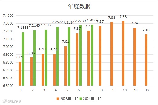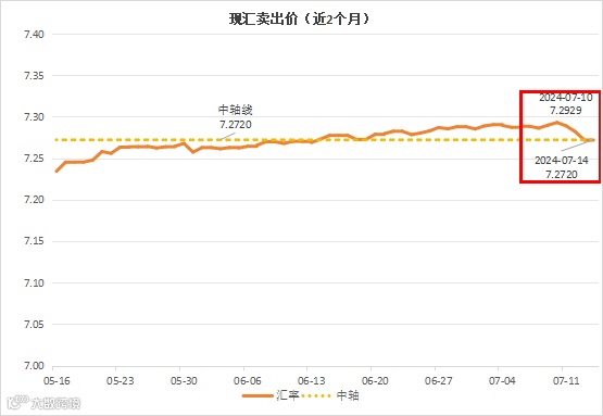 2024年第28周,周中最低7.2720,最高7.2929。周均价 7.2832,与第27周均价 7.2882,相较下降0.07%。2024年7月截至目前平均现汇卖出均价7.2857,环比上升0.16%,同比上升6.79%。