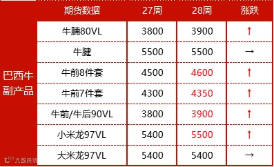 2024年第28周期货市场报价呈上涨态势,成交整体暂未出现明显变化。巴西多数部位如牛腩80VL、前件套、牛前牛后90VL、西冷眼肉和小米龙97VL等价格均有上涨,阿根廷、乌拉圭大部分部位价格均持稳。期货整体成交水平暂未出现明显变化。进口商询还价积极性虽较高但对以当前价格承接货物多踌躇不前,还价与工厂报价之间多存在200-300美元/吨差距,议价僵持局面下期货整体成交量处偏低水平。