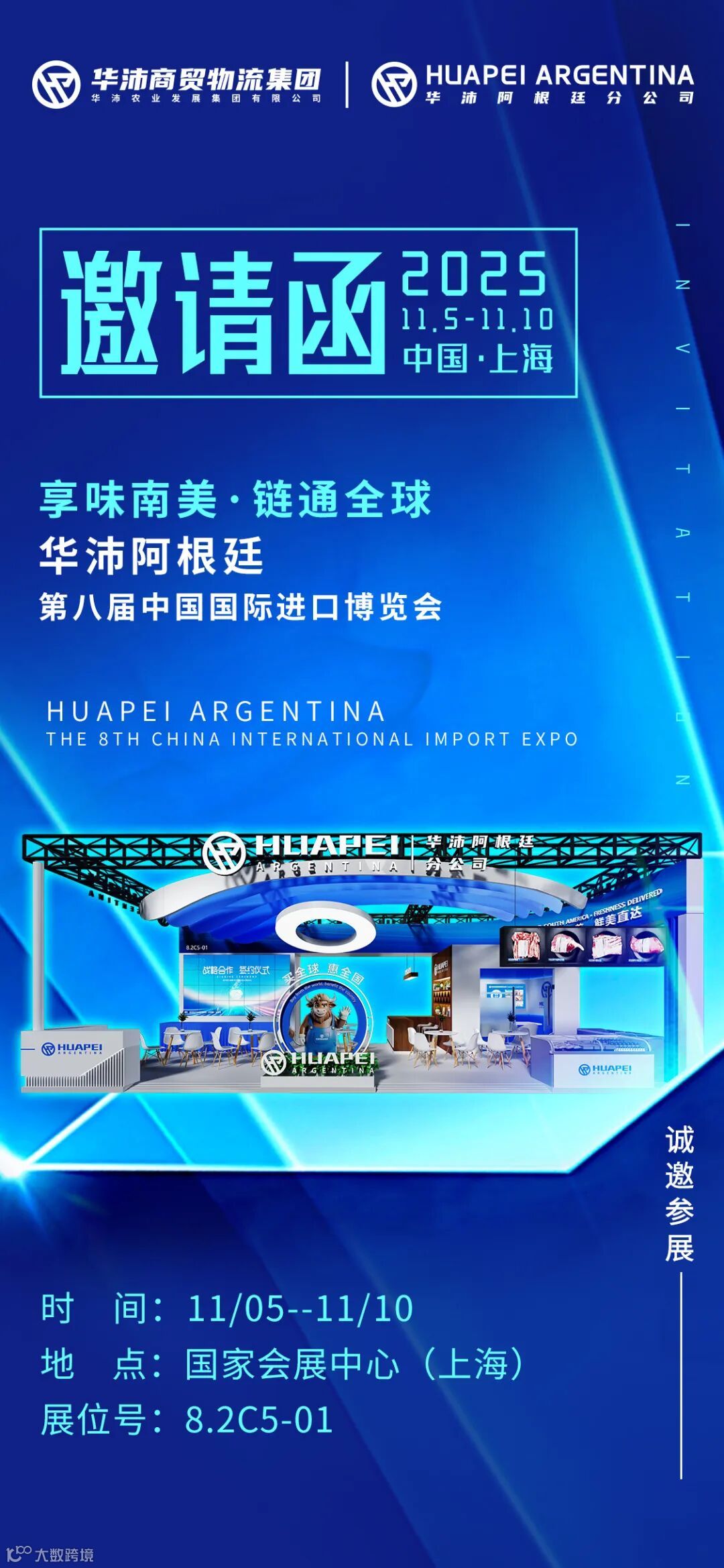 11月5日-10日,第八届中国国际进口博览会将在上海国家会展中心盛大开幕。作为我国进口冻品供应链领域的领军企业,华沛将携阿根廷分公司、全新高端谷饲牛肉品牌 “华沛牧云”首次精彩亮相,依托进博会全球贸易合作平台,与海内外冻品行业同仁展开深度交流,聚焦进口冻品供应链的全球化布局、数字化升级与品质化发展三大核心议题,共同探讨行业在消费升级背景下的市场机遇与挑战。