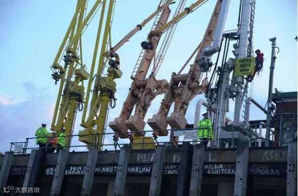 警方希望将一名爬上码头的抗议者赶走,该抗议者挡住了卸货管道。(Saf Suleyman 照片由绿色和平组织提供)
