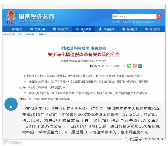 导读:3月21日,财政部、税务总局、海关总署联合发布《关于深化增值税改革有关政策的公告》(2019年第39号公告),自2019年4月1日起,进口货物原适用16%增值税税率的,税率调整为13%,原适用10%增