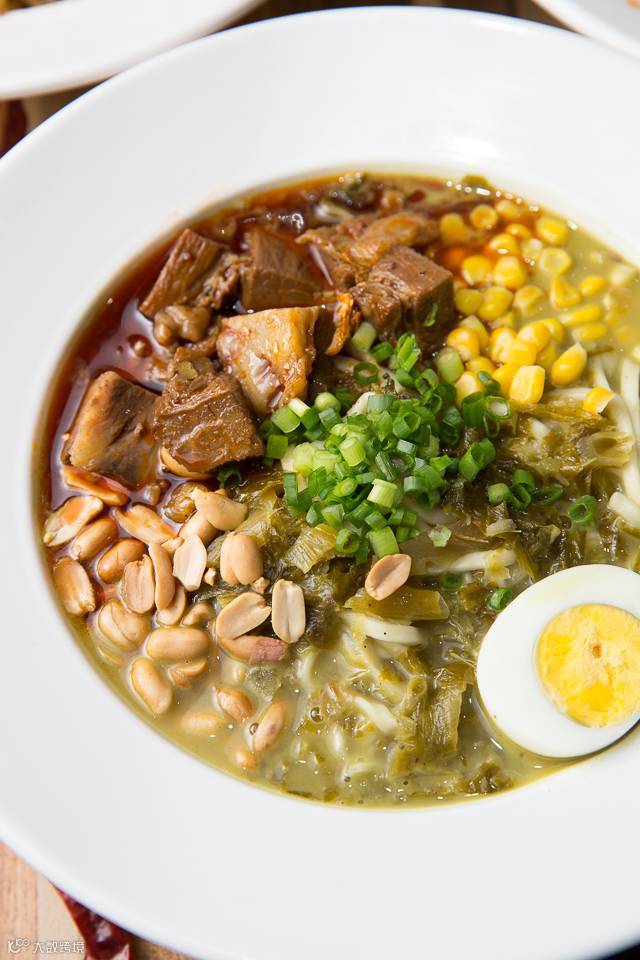 四川地道的老坛酸不甘寂寞,径自张扬着属于自己的独特味道,脆爽的花生碎和鲜嫩的玉米粒一拥而上,大块儿牛肉混着弹滑的面条大口吞下,堪称酣畅淋漓。