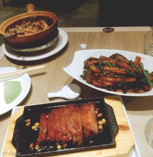 回味煲仔饭,石锅里放着米饭,上面铺了一层腊肉腊肠花生,上菜的时候服务员会现放上葱和香菜,然后淋上酱汁,拌好。米饭颗粒饱满很香,粘在石锅壁上的变成锅巴很脆。腊肠腊肉有一种独特的腌制味道真的很棒!