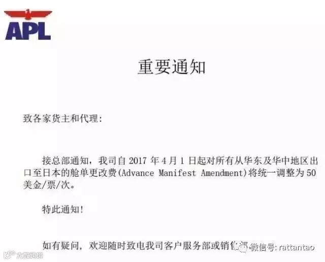 4月1日起APL对所有从华东及华中地区出口至日本的舱单更改费(Advance Manifest Amendment)将统一调整为50美金/票/次。此外,从2017年4月1日起,APL在各中国港口的THC将从目前的平均每TEU人民币675.70,下降到平均每TEU人民币575.7