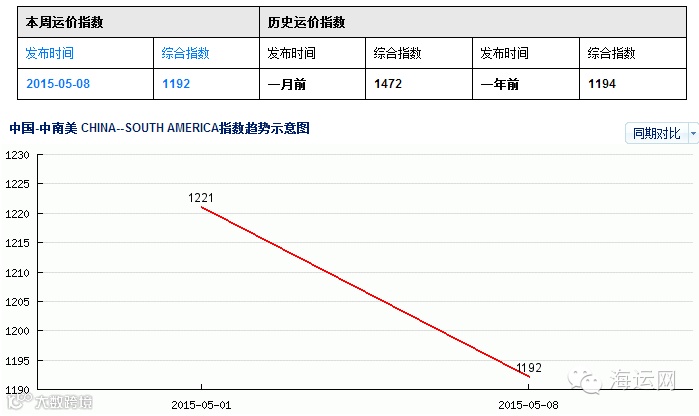 中南美航线,由于装载不佳,上周提涨运价未能企稳,多数航商为提升货量而下调订舱运价。5月8日,中国出口至中南美运价指数为1192点,较上周上下跌0.29%。