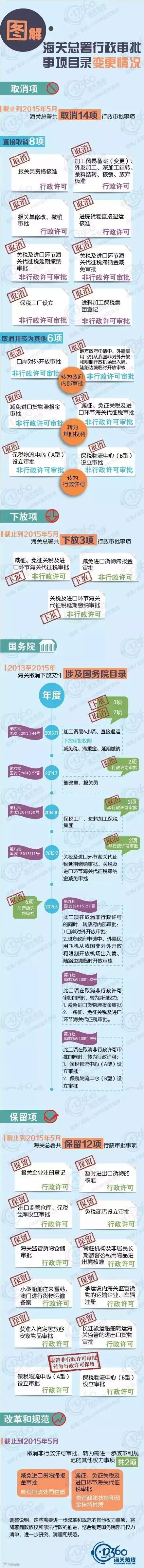 导读: 截止到2015年5月,海关总署共取消14项行政审批事项;下放行政审批事项3项;涉及国务院目录17项;目前仍