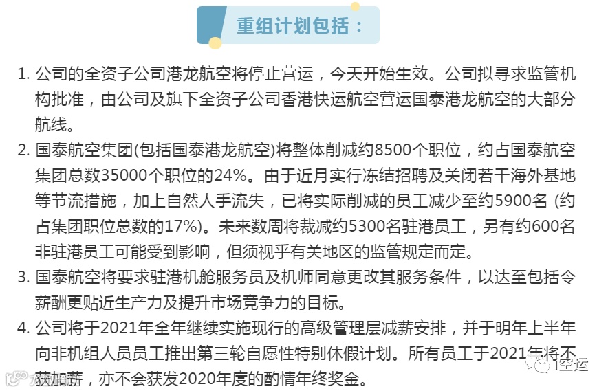 国泰航空集团今天刚公布的企业重组计划即日生效!这项重组内容包括停运公司旗下的KA国泰港龙航空,并且整体裁员约8500人。