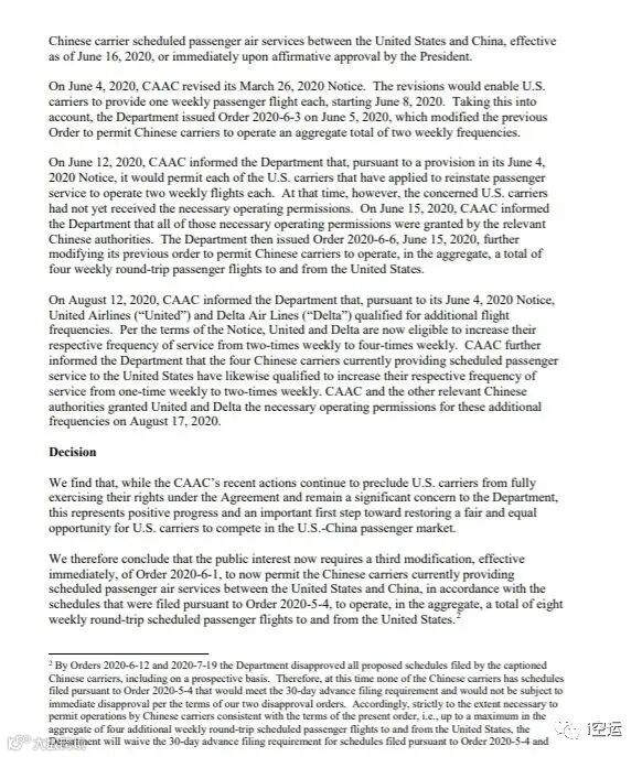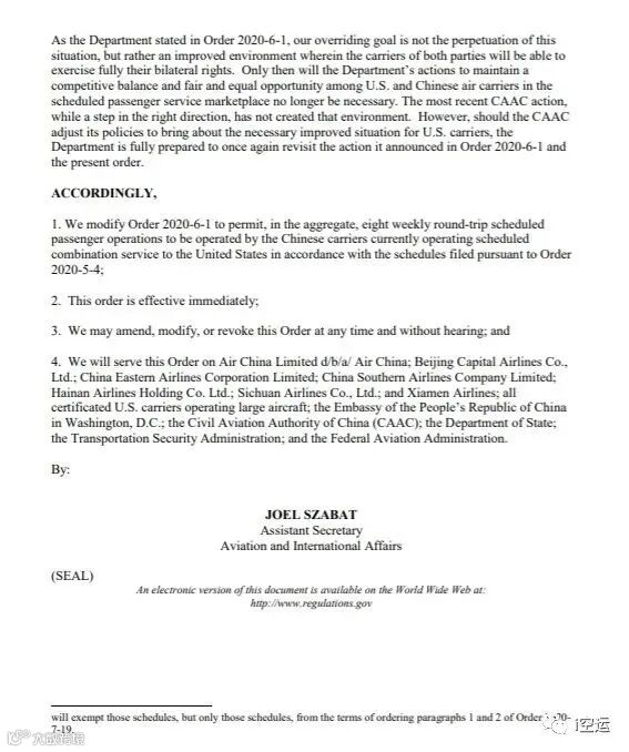 美国交通部最新文件,目前中国航司可以运营总计每周8趟往返航班。
