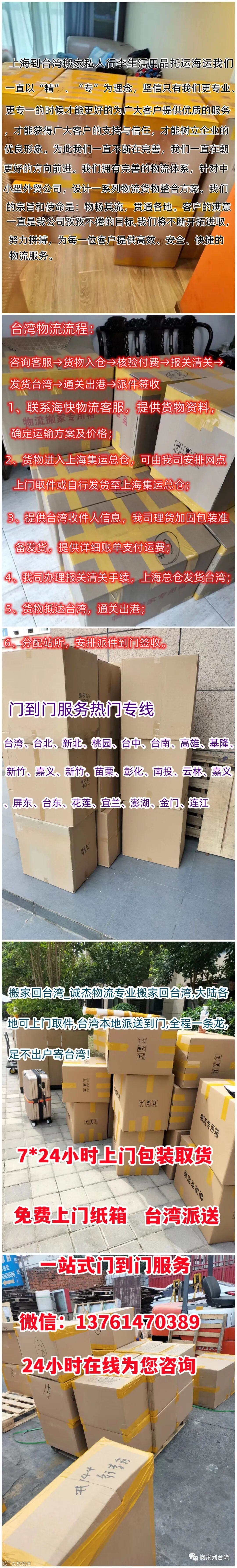发货方式直接联系台湾专线物流公司即可,比如说诚杰物流台湾专线都是在线一对一对接客户的,随时可以联系到。流程基本上也可以内地发快递一样了,电话联系好,告知物品种类、数量、体积或者重量,然后确定运输方式与费用,再发货到集运仓就可以了。