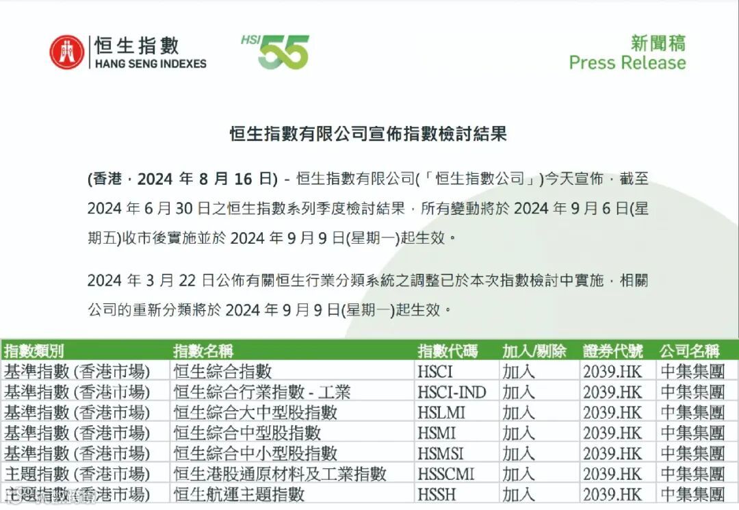 相关变动将于2024年9月6日(星期五)收市后实施并于2024年9月9日(星期一)起生效。