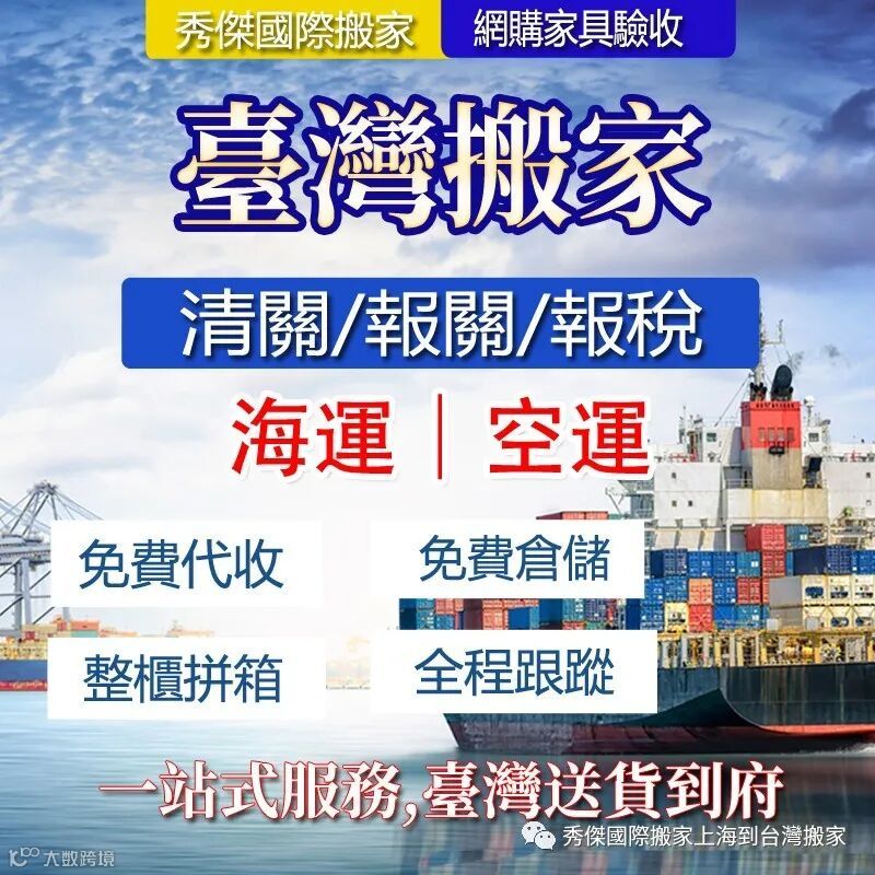 秀杰国际搬家专业提供上海 苏州 昆山到台湾搬家.家具托运.行李托运等、仓储打包、托运、零担、配送、海运、空运、网络联运为壹体的现代化搬家物流服务企业。秀杰国际搬家是经上海市交通局批准,经市工商、税务部门注册,具有500万元注册资金的独立法人企业。上海搬家运输行业成立较早的上海到台湾搬家公司之壹。