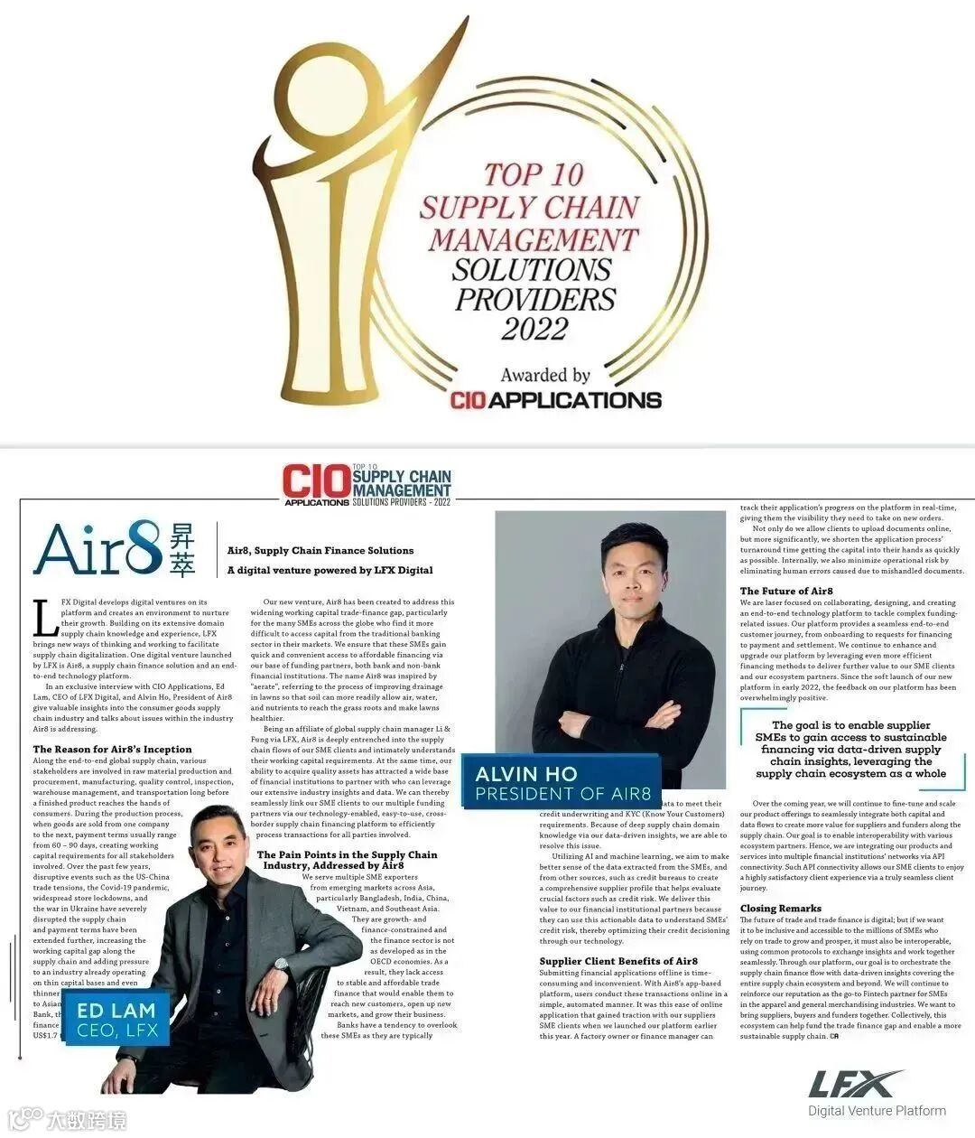获奖企业代表LFX首席执行官林崇礼和昇萃Air8总裁何斯明接受了 CIO Applications杂志的独家专访,他们在访谈中分享了对消费品供应链行业的见解,并讨论了昇萃Air8正在解决的业内问题。