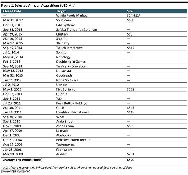 Whole Foods是Amazon历史上最大手笔的并购。而在过去的7年里,Amazon平均每年都要并购4.5家公司,下表回顾了Amazon这几年的并购史。