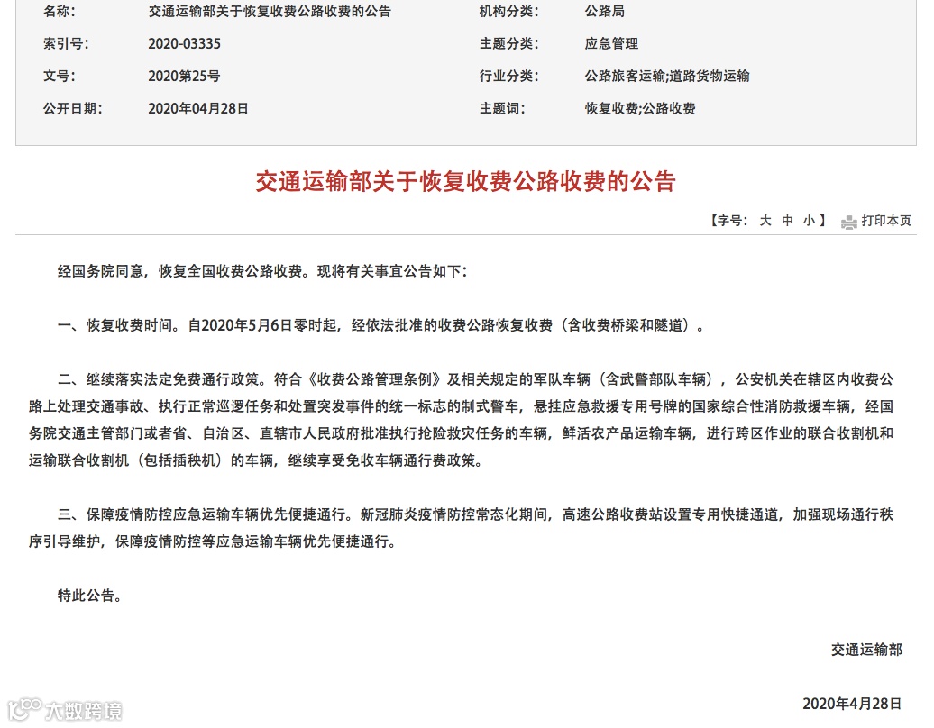 4月28 日,交通运输部在官网上发布了关于恢复收费公路收费的公告。