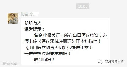 可不,昨天HG又发了新通知,所有出口医疗物资,必须上传《医疗器注册证》正本扫描件!《出口医疗物资声明》须提供正本!WHAT?不是说好的无纸通关吗?怎么现在还要搞纸质申报文件啊。小编头大了,于是,赶紧对出医疗物资的客户发通知,寄正本过来!