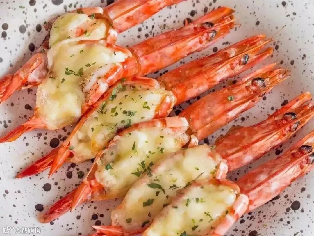 也可以用类似龙虾的方式做芝士焗虾。提前将黑虎虾的虾须和虾脚剪掉,刀切开后背取出虾线,虾背展平后,加香料煎出红色。之后在虾背上撒芝士,放入烤箱焗至金黄即可。