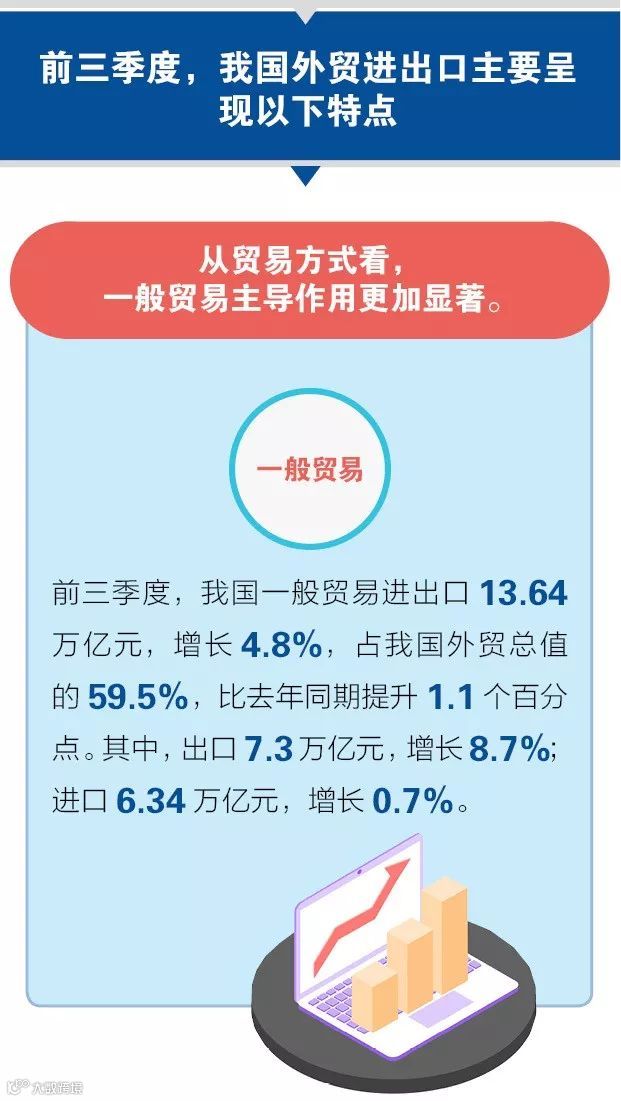 一是一般贸易主导作用更加显著。一般贸易方式进出口国内产业链较长,更能体现我国外贸的自主性。前三季度,我国以一般贸易方式进出口增长4.8%,高出外贸整体增速2个百分点,占我外贸总值的59.5%,比重提升1.1个百分点。