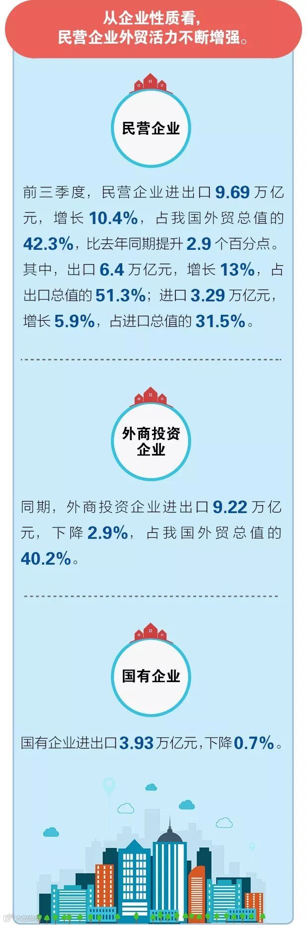 二是民营企业带动作用更加突出。民营企业在减税降费等政策利好下,展现出更强的活力,已经成为带动我国外贸增长的主要力量。前三季度,我国民营企业进出口增长10.4%,高出外贸整体增速7.6个百分点,占我外贸总值的42.3%,比重提升2.9个百分点。其中,出口增长13%,占我国出口值的比重超过一半。
