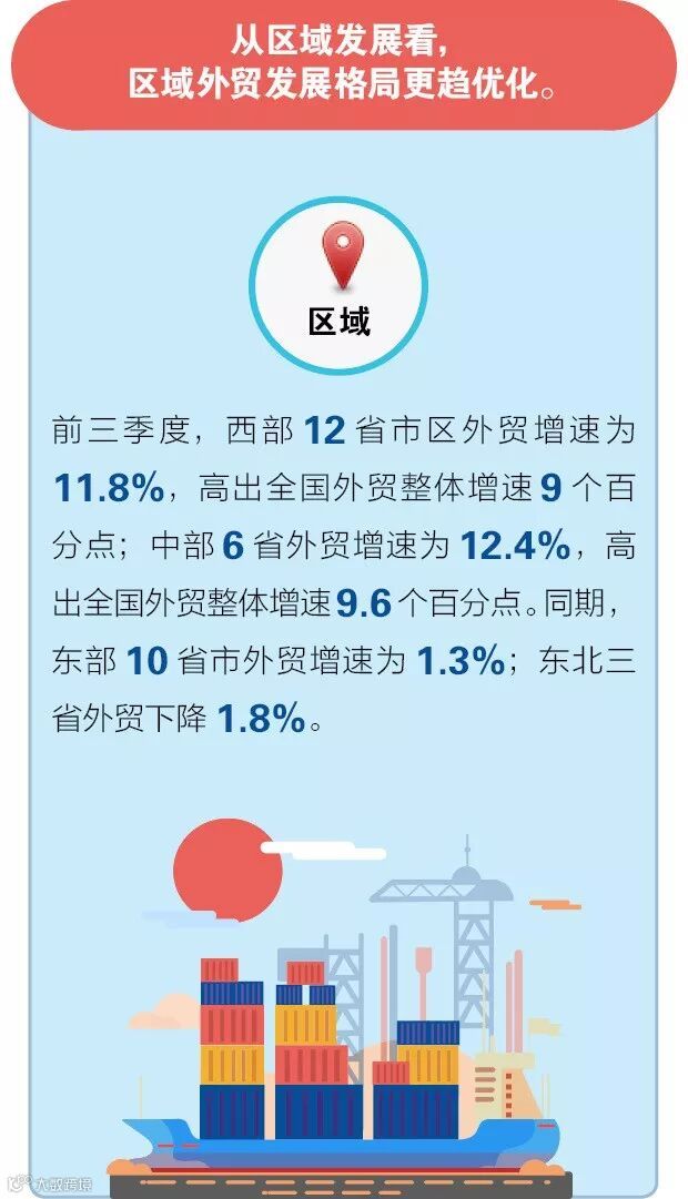 三是区域外贸格局更加优化。今年以来,我国区域战略稳步实施,京津冀协同发展、长江经济带发展、长三角一体化高质量发展、粤港澳大湾区建设、海南全面深化改革等重大战略深入推进,黄河流域生态保护和高质量发展也成为国家重大战略,大大促进了我国外贸的协调发展。中西部地区依托自身优势、加快对外开放步伐,积极承接东部地区产业转移,今年以来外贸呈现快速增长势头。前三季度,中部、西部地区进出口分别增长12.4%和11.8%,占我国外贸比重分别提升0.6和0.7个百分点。