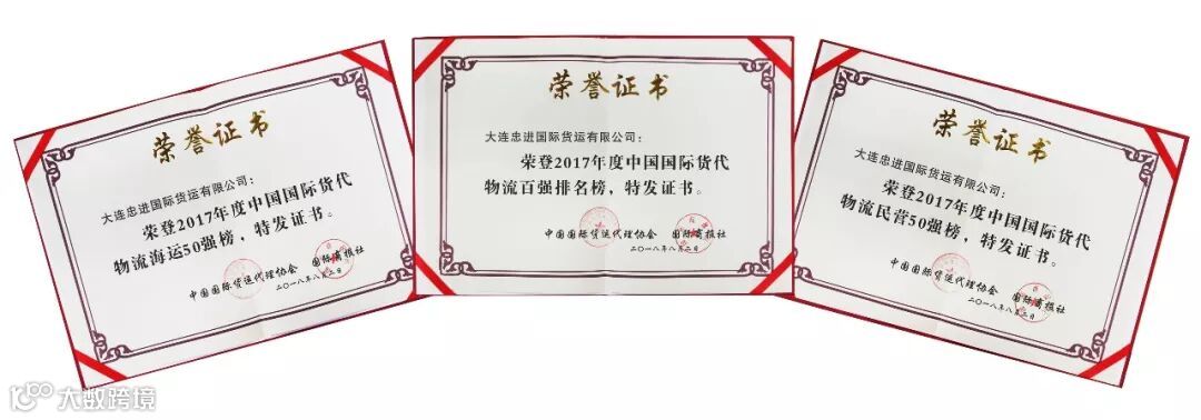 从2004年起至今大连忠进连年入选 “2017年度中国货代物流企业百强” “2017年度中国货代物流民营五十强” “2017年度中国货代物流企业海运五十强”三大榜单;在中国报关协会组织的全国优秀报关企业评选中,大连忠进通过史上最严评选标准,在近400家参加评选的国内报关行中脱颖而出,再次获得“全国优秀报关企业”称号,最终在164家获得称号的报关企业中排名第22位。这也是大连忠进连续第三届获得该称号。
