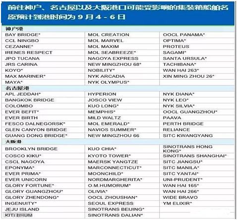 未来几日前往神户、名古屋、大阪港口的船舶船期或将受到影响。根据大船期给出的信息,以下84艘前往神户、名古屋、大阪港口的集装箱船舶船期可能受到影响,这些船舶的原定预计到港时间 为9月4-6日: