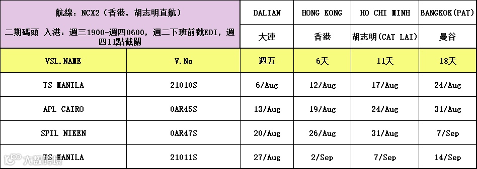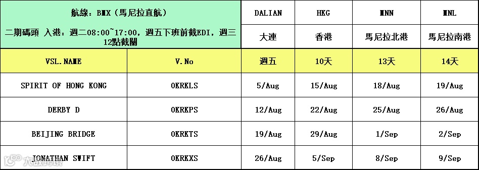 另可承接:香港中轉巴生西、北港、巴西古当,海防; 蛇口中轉檳城,馬尼拉南、北港,曼谷、林查班、雅加达、清奈、維薩;青島中轉悉尼、墨爾本、布里斯班