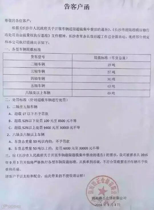 虽然各地对新规的响应比较积极,但是对于规定的要求个别公司理解的并不透彻,以湖南联正仓储有限公司为例,在给出的客户函告知中,六轴及以上车辆的车货总重统一定义为49吨,并未提及6X2车型限重为46吨,容易让人产生歧义。