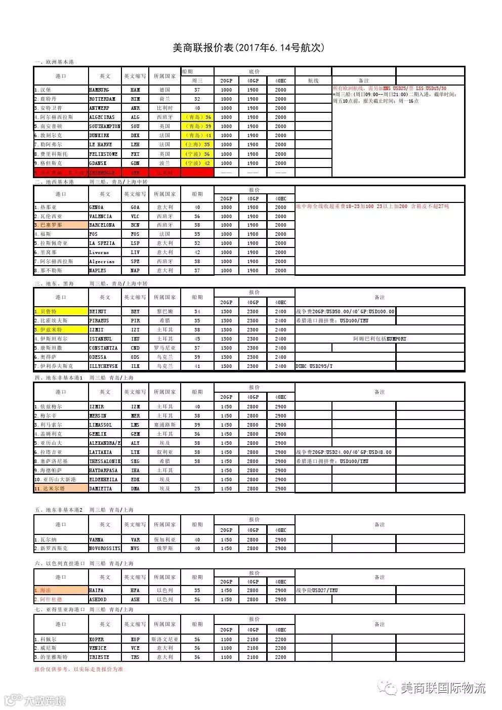 美商联最新运价 2017-6-14