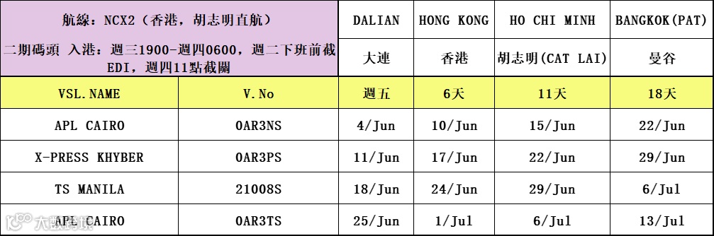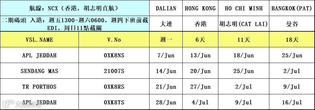 另可承接:香港中轉巴生西、北港、巴西古当,海防; 蛇口中轉檳城,馬尼拉南、北港,曼谷、林查班、雅加达、清奈、維薩、卡拉奇、墨尔本、布里斯班