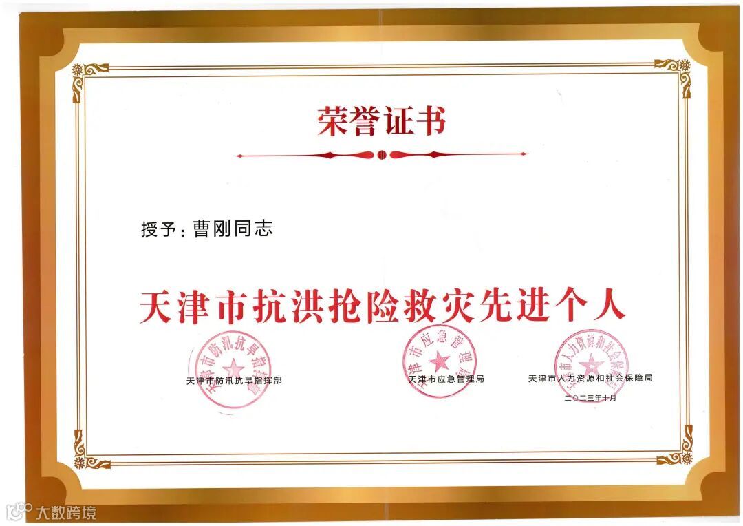 近日,天津市防汛抗旱指挥部、天津市应急管理局、天津市人力资源和社会保障局联合印发文件,对天津市抗洪抢险救灾先进集体和个人进行表彰,交通集团直属交通客运公司曹刚荣获“天津市抗洪抢险救灾先进个人”称号。