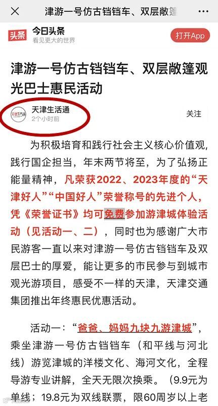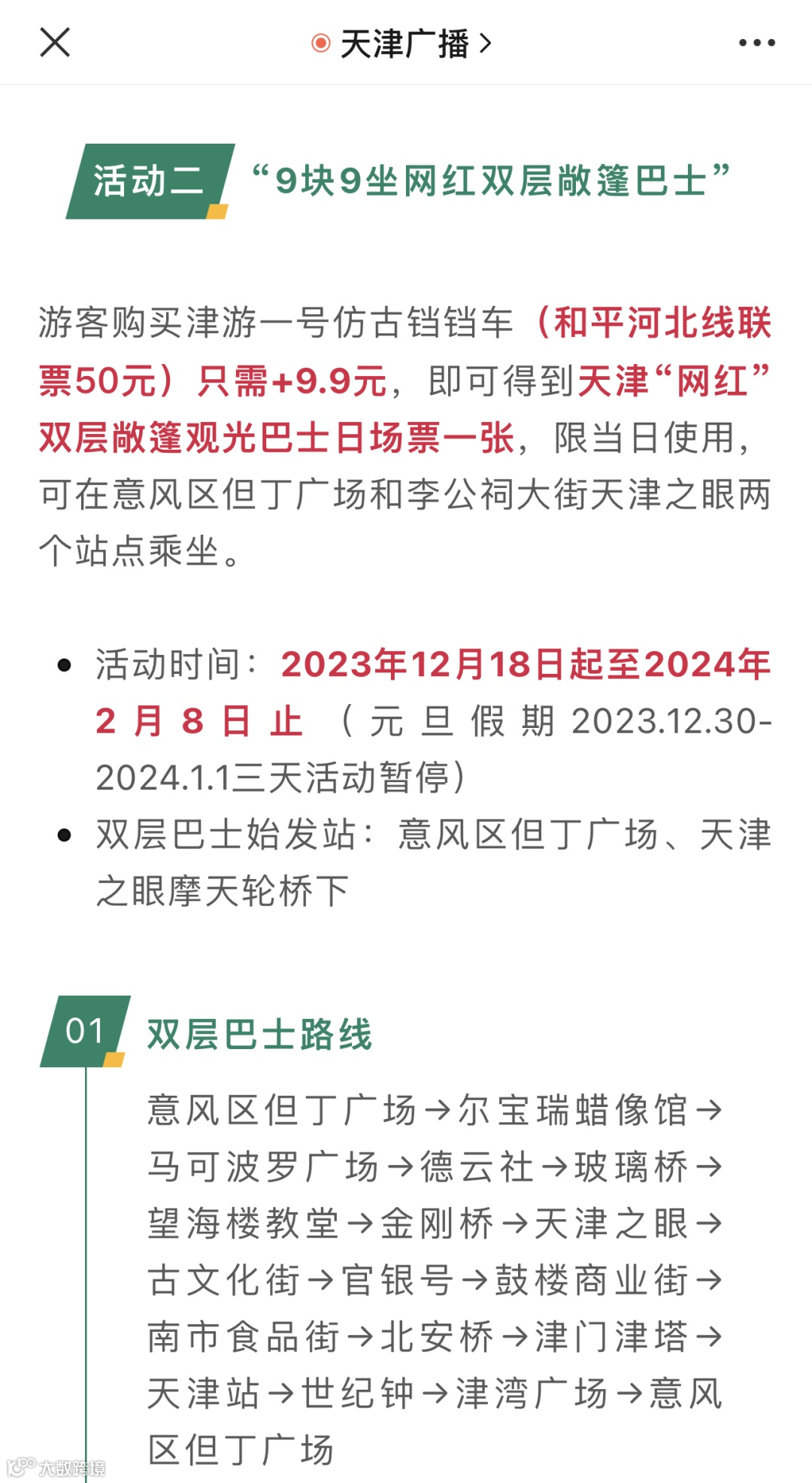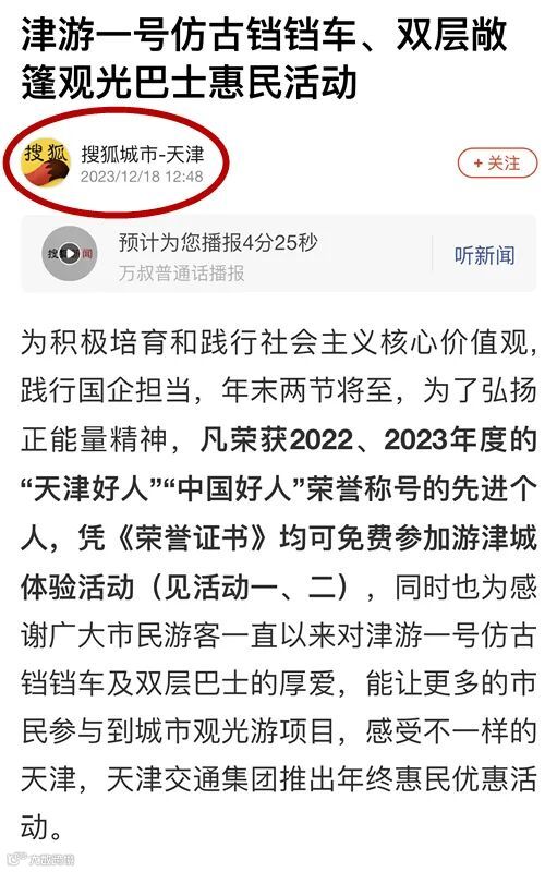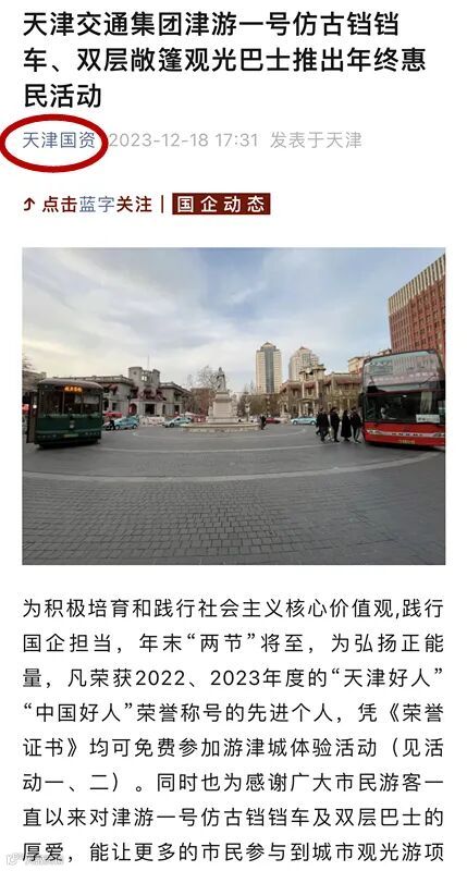 12月18日,天津交通集团推出津游一号仿古铛铛车、双层敞篷观光巴士年终惠民活动,新华网、津云客户端、天津广播、搜狐天津、天津国资、今日头条天津生活通号等6家中央和市级官方主流媒体和自媒体平台对活动进行持续宣传报道,反响热烈,获得广泛好评。