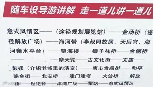 双层观光巴士始发站意式风情区,途经意式风情区、摩天轮、古文化街、鼓楼、津门津塔、津湾广场、天津站,再返回意式风情区。双层观光巴士旅游专线,将车、景、人、服务解说有机构成了一个整体,使游客在乘车的途中,既观赏到津城的著名景点,人文景观,特色建筑,桥梁道路,感受天津日新月异的变化,宣传了美丽天津,又品味了津城文化的特色和韵味。