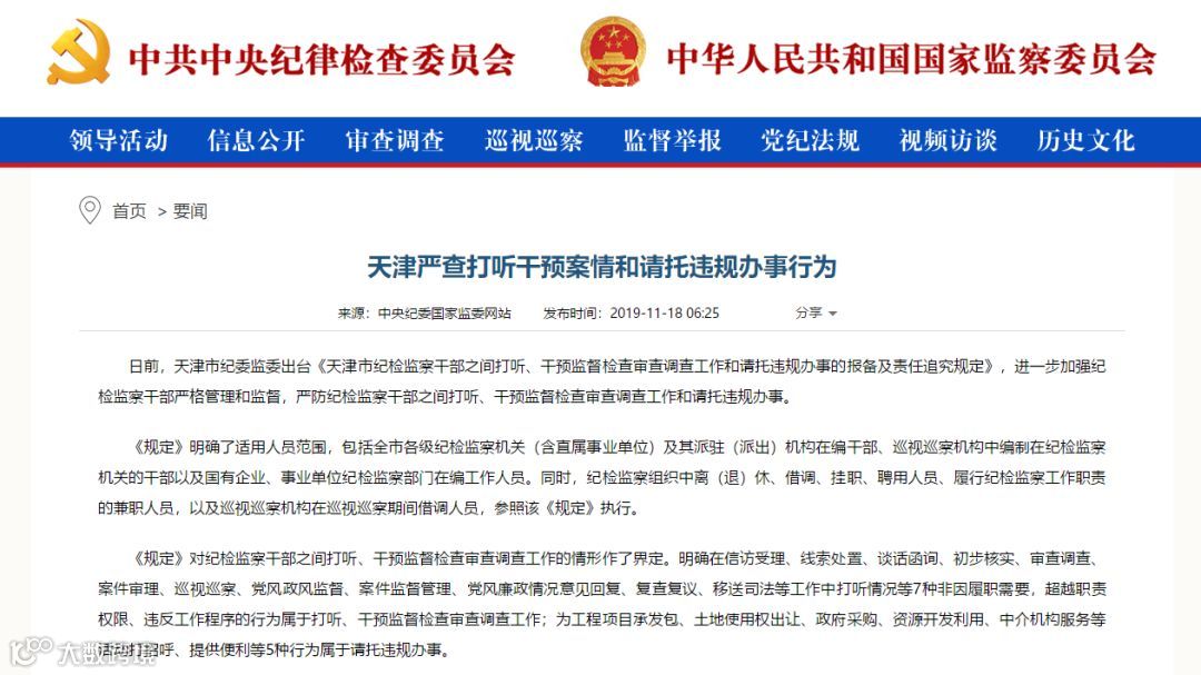 11月18日,中央纪委国家监委网站刊文《天津严查打听干预案情和请托违规办事行为》,对我市进一步加强纪检监察干部严格管理和监督,严防纪检监察干部之间打听、干预监督检查审查调查工作和请托违规办事进行报道。