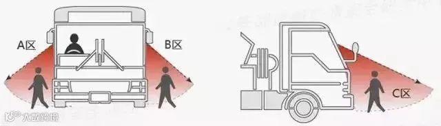 A、B、C区域为半盲区,半盲区的危险范围视大车的尺寸而定。 靠近车体下方会进入半盲区,越靠近,越不容易被大车司机发现。