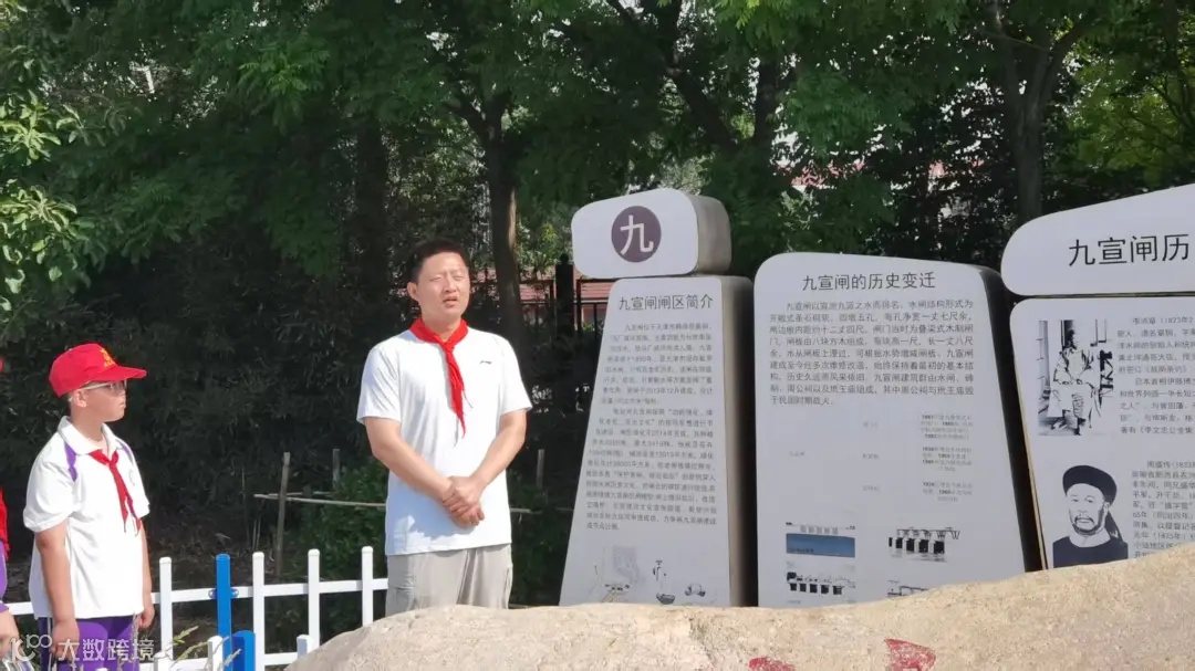 穿越百年:在水利丰碑中聆听古今对话。晨光初熹,师生们首先抵达有着“津门水利命脉”之称的九宣闸(位于靳官屯村)。这座始建于光绪七年的水利工程,以其独特的功能设计,曾驯服太行春汛、守护津沽百年。站在闸顶观景台,古制启闭机关的幽光与无人机巡检的嗡鸣相映成趣,老船工的漕运故事与数字导览系统的历史解说交织共鸣。学生们俯身观察古码头被岁月磨圆的苔痕,在“运河生态步道”上追寻漕运遗址,真切感受“活文物”九宣闸如何在古今碰撞中延续水利智慧。