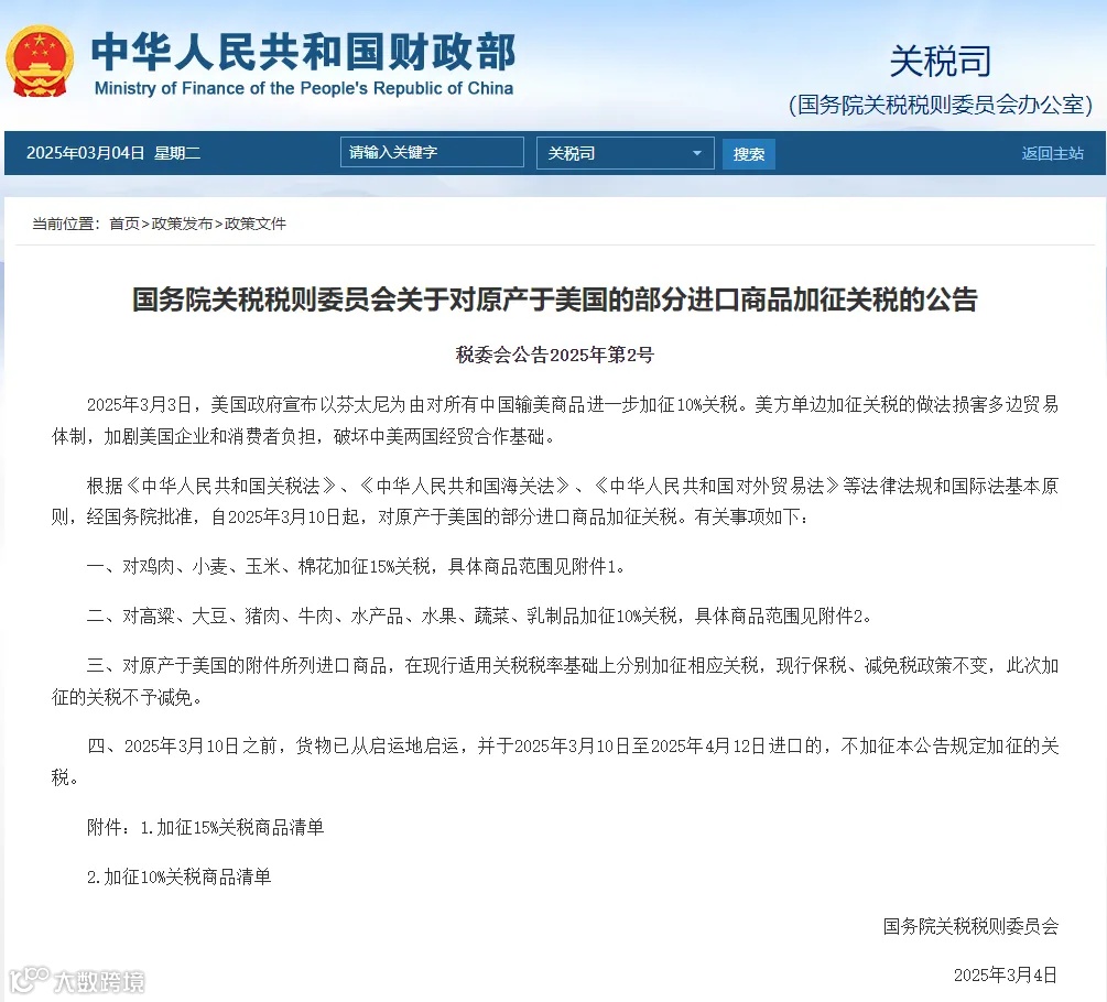 根据《中华人民共和国关税法》、《中华人民共和国海关法》、《中华人民共和国对外贸易法》等法律法规和国际法基本原则,经国务院批准,自2025年3月10日起,对原产于美国的部分进口商品加征关税。有关事项如下: