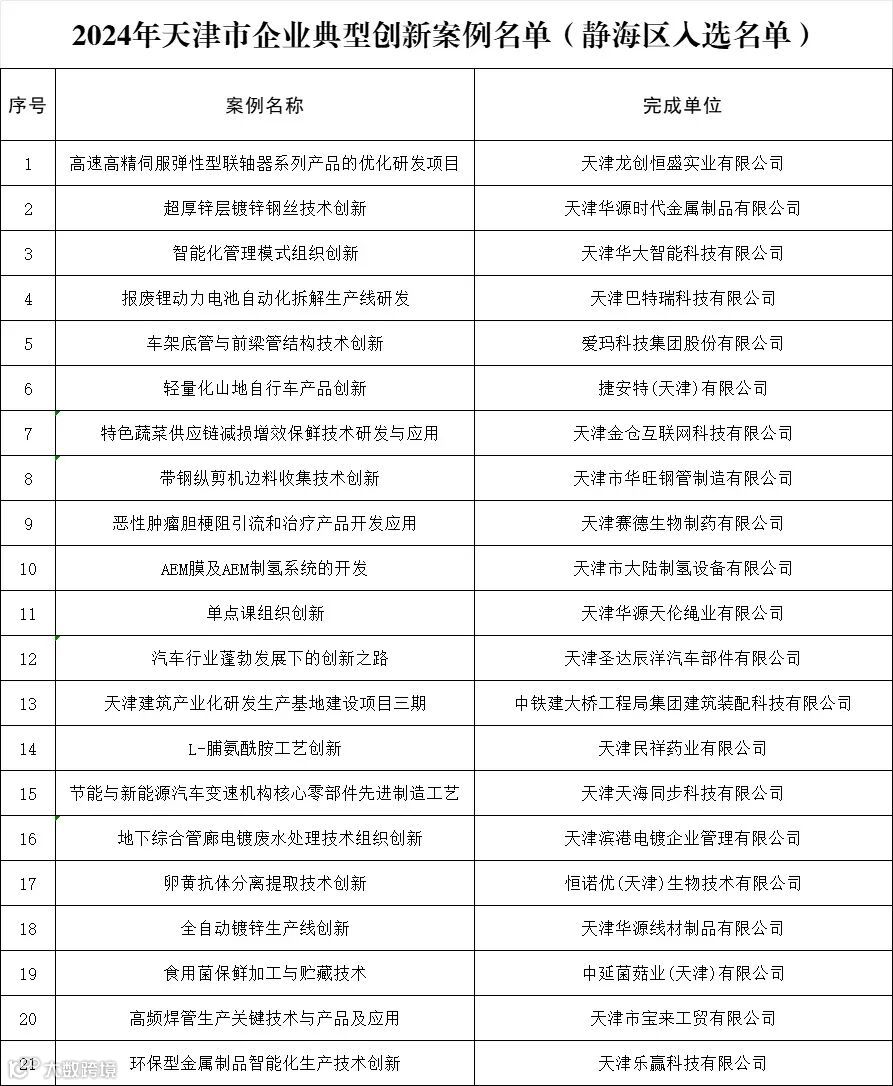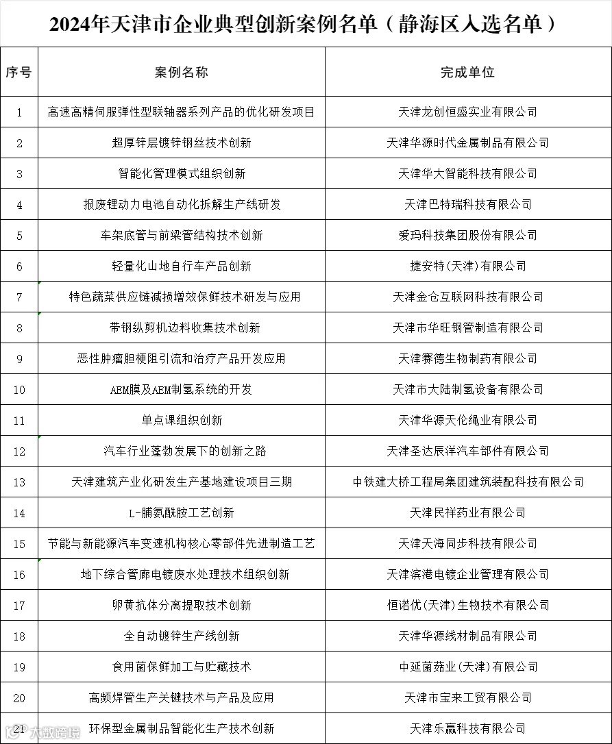 近日,天津市科协《2024年天津市企业典型创新案例入选名单》揭晓,名单共计100家企业,静海区21个创新案例成功入选。