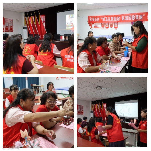 东河头巾帼志愿服务队组织村民利用生活废物制作手工艺品,并现场为村民详细讲解创卫的意义,播放“创卫”工作宣传视频。
