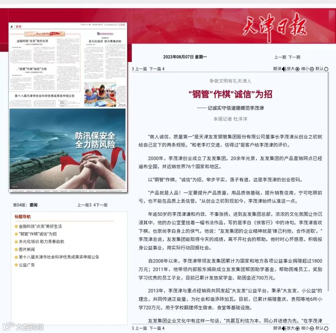 第一”是天津友发钢管集团股份有限公司董事长李茂津从创业之初就给自己定下的两条规矩。“和老李打交道,信得过”是客户给李茂津的评价。