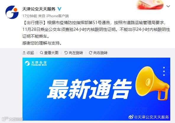根据市疫情防控指挥部第51号通告,按照市道路运输管理局要求,11月28日乘坐公交车须查验24小时内核酸阴性证明。不能出示24小时内核酸阴性证明不能乘车。