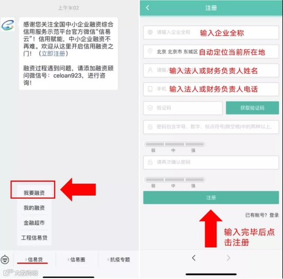 1、关注全国服务示范平台官方微信公众号“信易云”,进入公众号,点击左下角的“信易贷”—“我要融资”—“我的”—“登陆”—“注册账号”