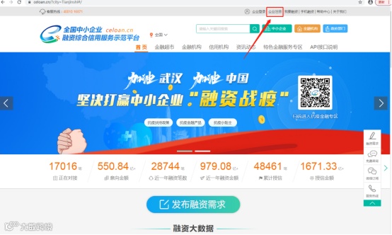 1、登录全国中小企业融资综合信用服务示范平台(下称全国“信易贷”平台,网址:www.tjcel.cn)