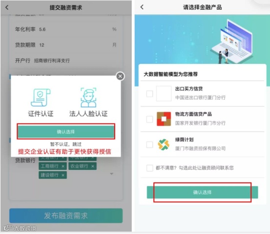 若没完成企业认证将会提示进行认证,也可跳过企业认证,最后平台系统将智能匹配适合你的金融产品,你也可以联系融资顾问,让融资顾问帮你匹配金融产品。