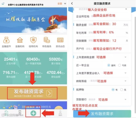 1、做完企业认证信息后,点击“加号”或者是在首页点击“发布融资需求”按钮发布融资需求