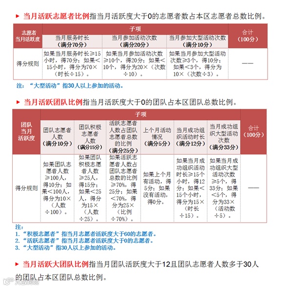 天津志愿服务指数构成分为注册志愿者人数占本地常住人口比例得分(10分)、有志愿服务时间记录的志愿者人数占注册志愿者总人数的比例得分(10分)、志愿者当月参与服务情况(30分)、团队当月参与服务情况(40分)、大型活跃团队分布情况(10分)五个子项,各个子项设置了三档分数,每一项根据文明城区测评体系、各区整体比例数值分布情况得出一个标准比例:对于达标区,得该子项满分的60%以上,同时对标每一子项第一名,在满分60%的基础上按比例增加;对未达标区,得该子项满分的60%以下,同时参考每一子项末位,在满分60%的基础上按比例减少。